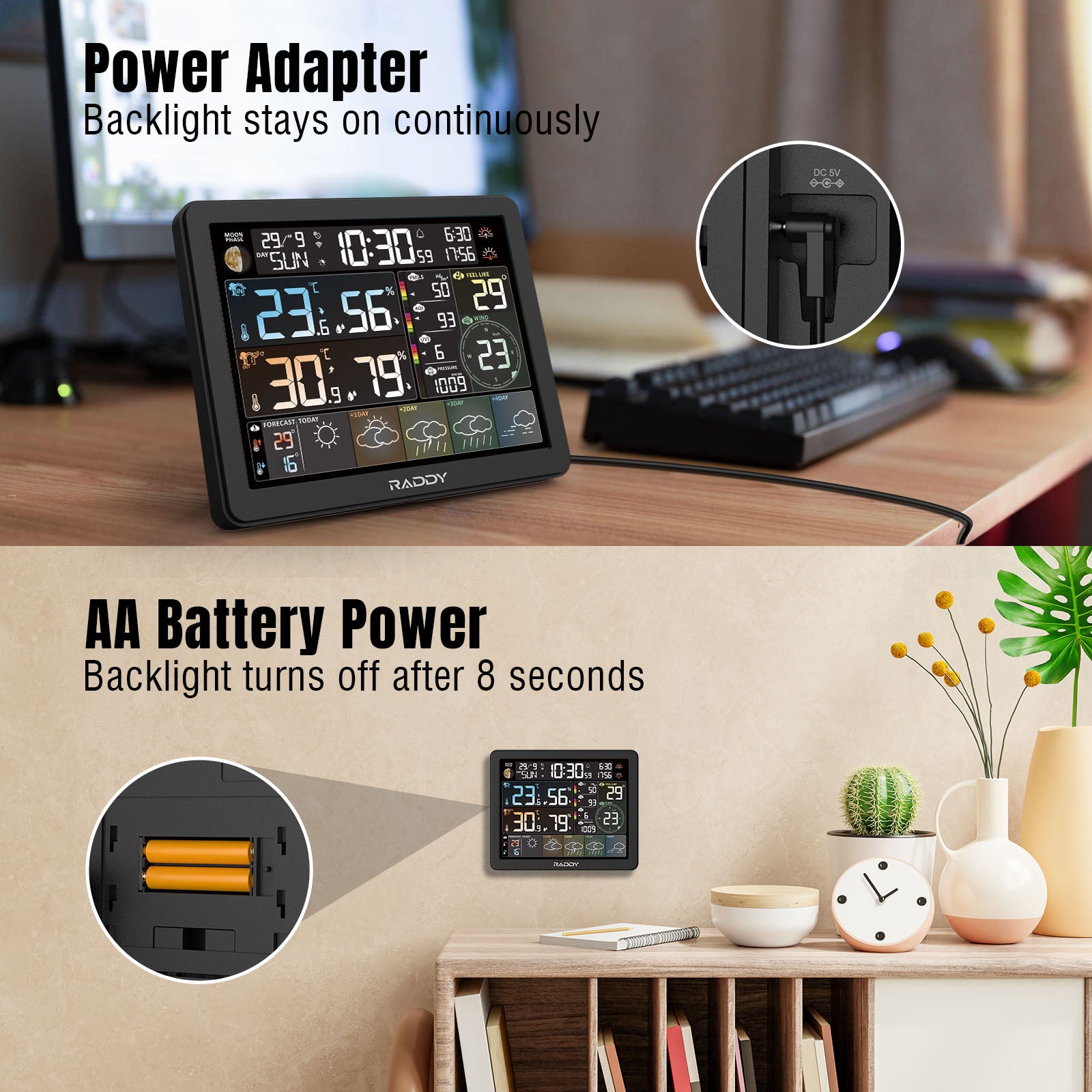 Experience advanced weather monitoring with the Raddy N80 Weather Station. Effortlessly connect via the Tuya app for easy operation and detailed data displays. Equipped with 4 customizable alarms and a convenient snooze function, it keeps you informed and on schedule. Enjoy comprehensive weather data and a 5-day weather forecast, and customize your view with five levels of backlight adjustment and automatic light sensing. The Raddy N80 is your ultimate tool for weather tracking and planning.