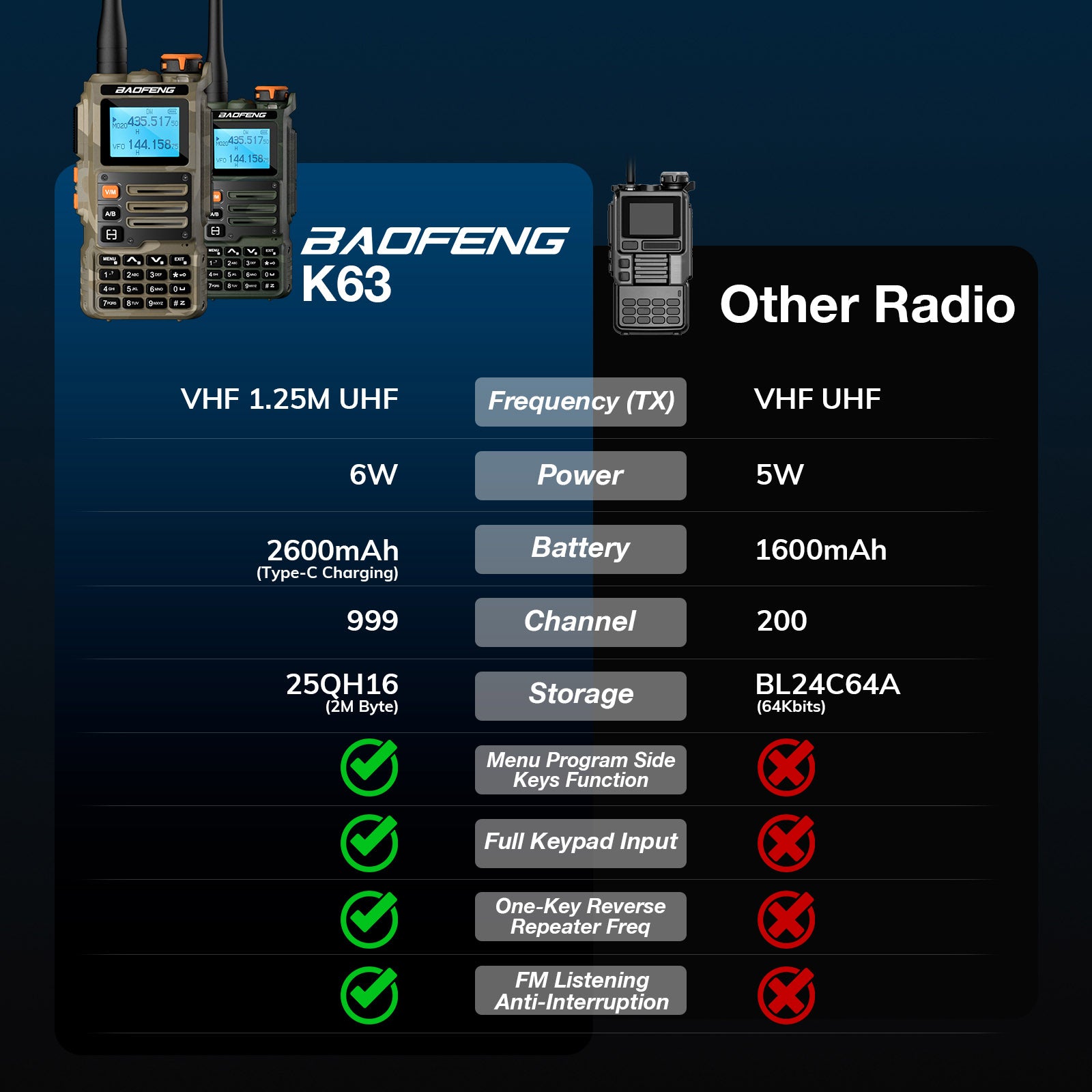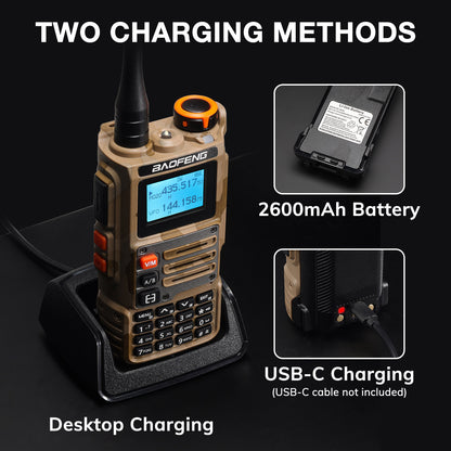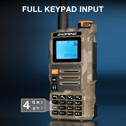 The BAOFENG K63 is a powerful and versatile two-way radio, offering reliable communication across various frequencies. With a robust 6W power output and multi-band transmission and reception, it guarantees clear, stable communication in any environment. Equipped with a 2600mAh battery, the K63 delivers all-day performance, while Type-C and desktop charging options keep it ready for action. Whether navigating outdoor adventures or managing on-site teams, the BAOFENG K63 combines performance and durability to meet your needs.