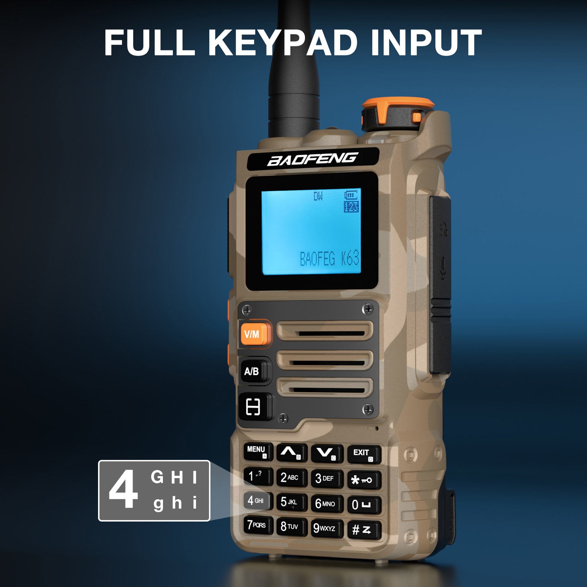 Easily input frequencies, text, and settings using the full keypad. Switch between uppercase, lowercase, and numbers with the "#" key, and quickly toggle letters by tapping the key in sequence.