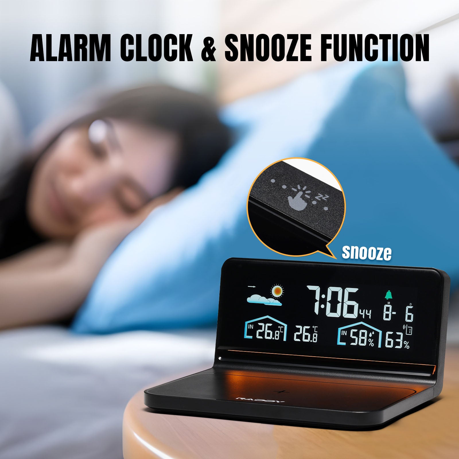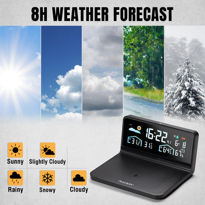 Upgrade your space with the Raddy DT5-W weather station, featuring 15W QI wireless charging for a clutter-free experience. The clear, wide-angle display ensures easy viewing of the time and weather from any position. Set alarms and use the convenient Snooze function, while the display offers four levels of manual backlight adjustment, automatic backlight settings, and a soothing ambient light strip beneath the screen. Keep track of daily high/low temperature and humidity records and stay informed with an 8-hour weather forecast.