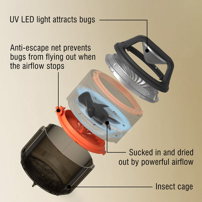 Introducing our innovative indoor insect trap, designed to effectively eliminate mosquitoes, fruit flies, gnats, and moths. Utilizing UV blue light attraction, then captured by a powerful fan and dehydrated to death inside the cage. The highlight of this trap is its anti-escape mesh design, no sticky glue is needed but ensuring pests remain trapped even when the power is off, saving energy. Physical pest control and friendly to kids, pets, and plants, providing efficient insect control without harmful substances. Enjoy peaceful nights with our easy-to-use, low-noise flying insect trap.