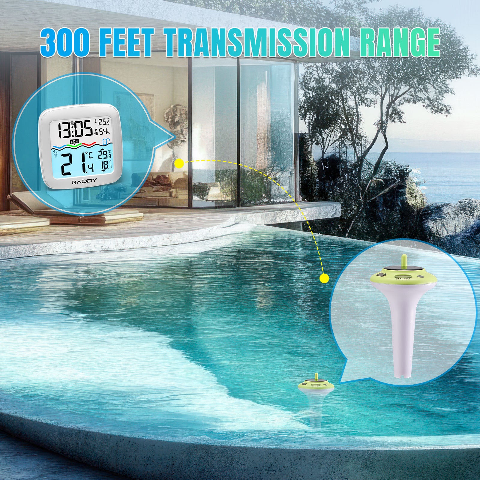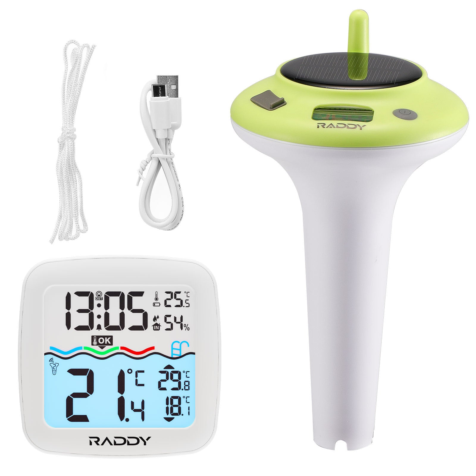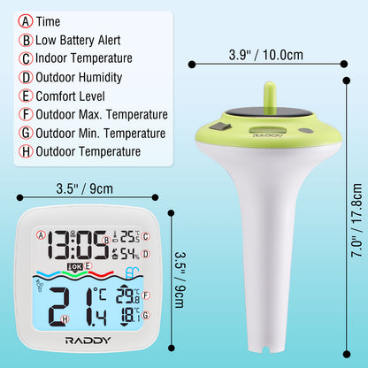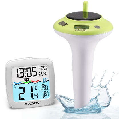 Raddy PT-5/PT-5 TN Solar Pool Thermometer | IPX8 | Solar & Battery Powered | Alarm Clock | Temperature Humidity Monitor
