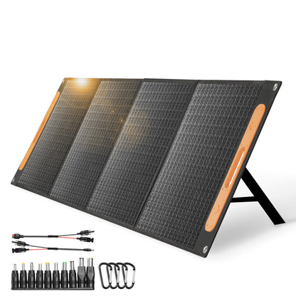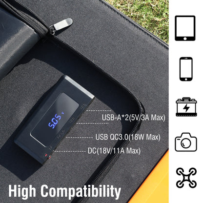 Whether you're RVing, camping, or powering your home in an emergency, the SP200 solar panel draws power from the sun while simultaneously charging your phone, iPad, or power station via the USB port. When folded, the solar panel area is reduced by 3/4 and takes up very little space. It is a compact and powerful monocrystalline solar panel with a high conversion rate of 23%.