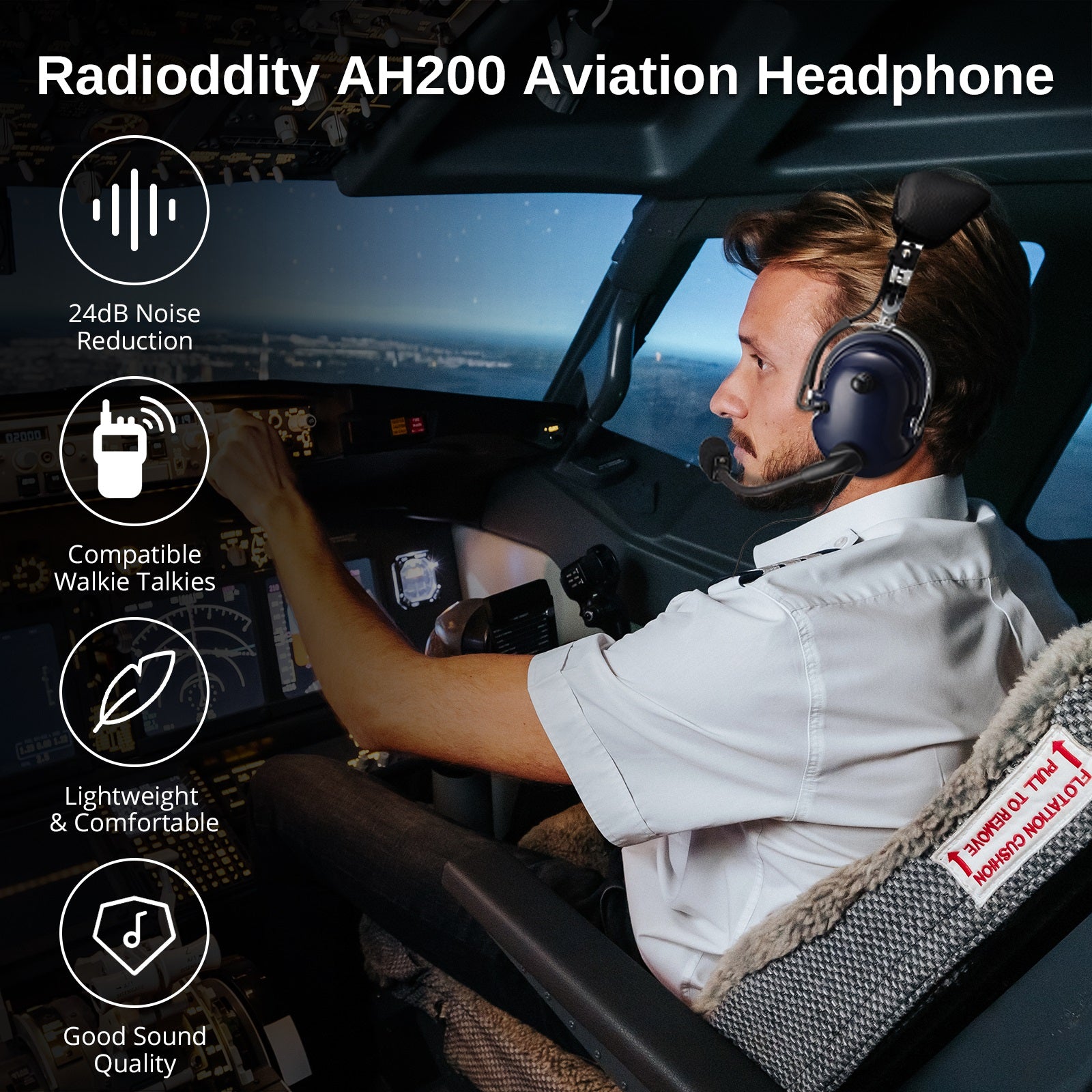 Radioddity AH200 General Aviation Headset | 24dB Noise Reduction | Adjustable Headband | 360° Full Flex Mic Boom