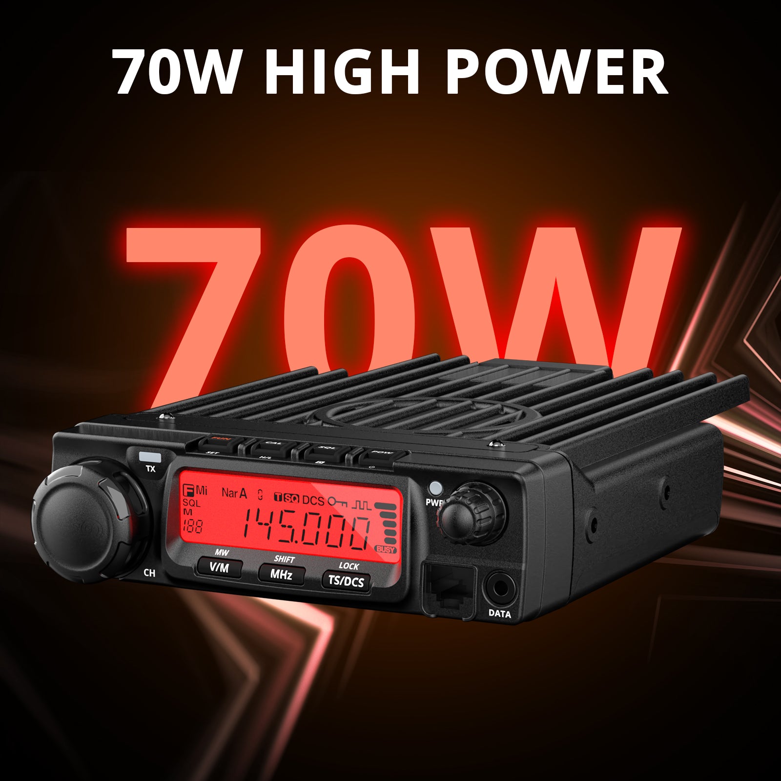 The Radioddity VB70-B is a high-performance ham mobile radio that offers selectable output options of 70W, 25W, and 10W, supporting VHF communication and Airband reception for variable needs With advanced NRC for clear, interference-free communication, it excels even in noisy environments. Bluetooth function allows you to connect a wireless PTT (included) and Bluetooth earpiece for convenient hands-free operation. Additionally, the 32-level background brightness adjustment ensures optimal visibility in any lighting. Whether you're a trucker, pilot, or amateur radio enthusiast, the VB70-B provides powerful, clear communication wherever you are.