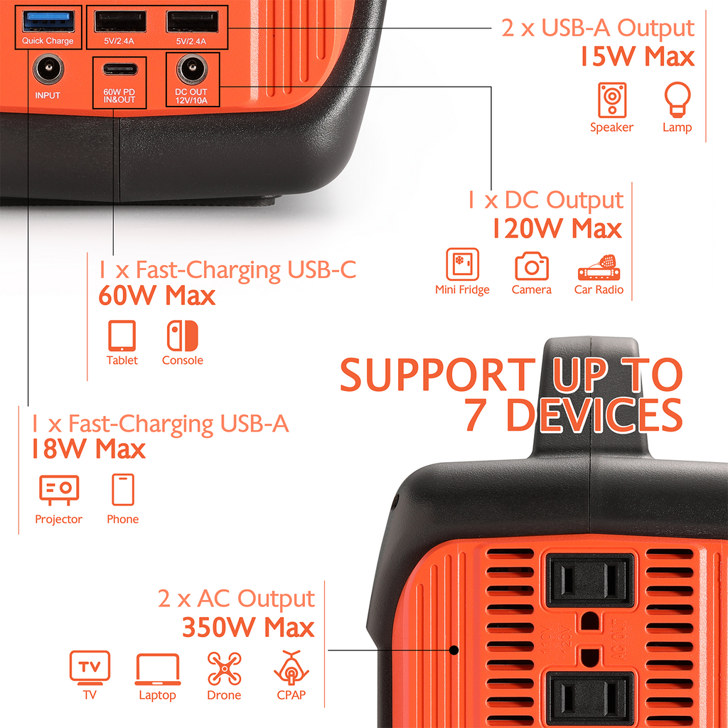 Multiple output 2 x AC OUTPUT : 110V/220V|300W 2 x USB-A OUTPUT: 5V/2.4A 1 x PD USB-A OUTPUT: 5V/2.4A | 9V/2A | 12V/1.5A 1 x DC INPUT: 15V/2.5A 1 x PD USB-C OUTPUT & INPUT: 5V/3A | 9V/3A | 12V/3A | 15V/3A |20V/3A 1 x DC OUTPUT: 12V/10A |